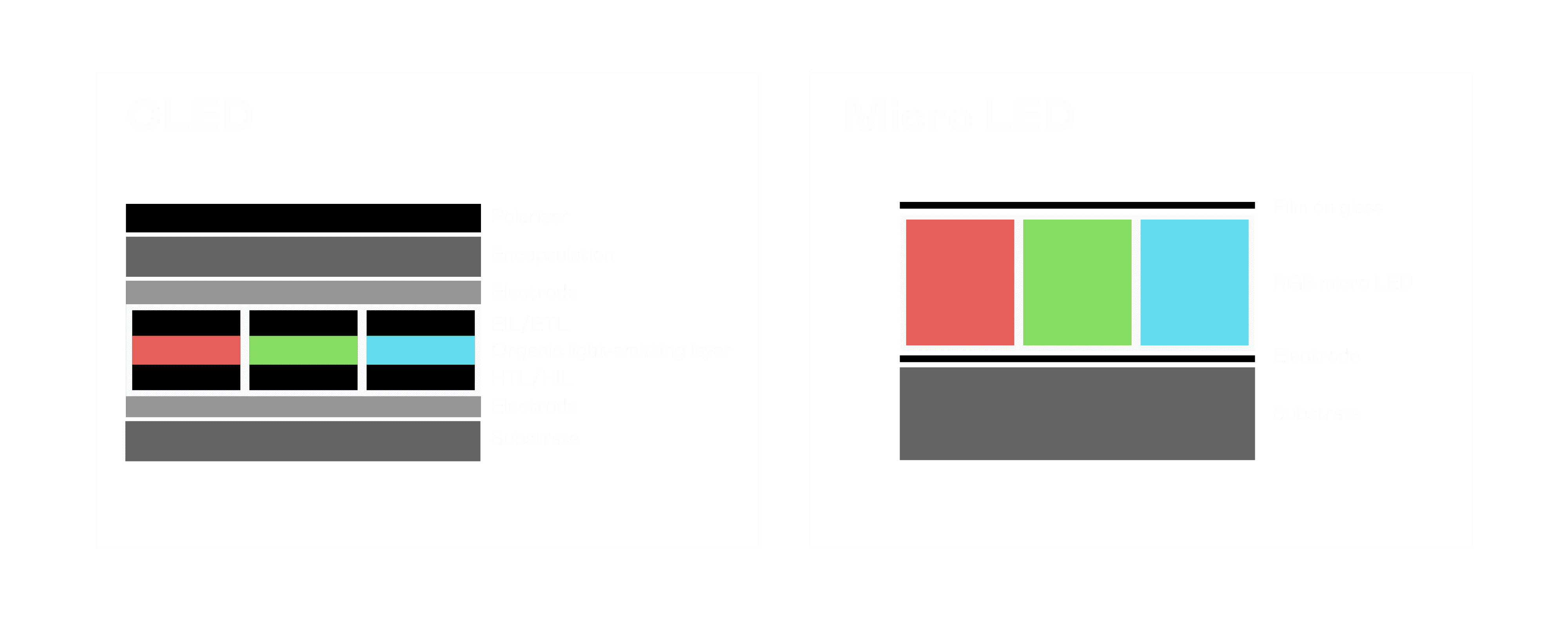 以 LED 做为显示画素,,,可让 LED 的发光效率发挥到极致,,从而让显示器具备优异的亮度表现,,,不论是在户外或室内,,,,均具备出众的显示效果。。同时,,,,与使用有机材料的 OLED 相比,,LED 具备更稳定、、、、寿命更长的特性,,,不仅不会有画面烙印问题,,而且更不容易出现故障、、坏点。。。。