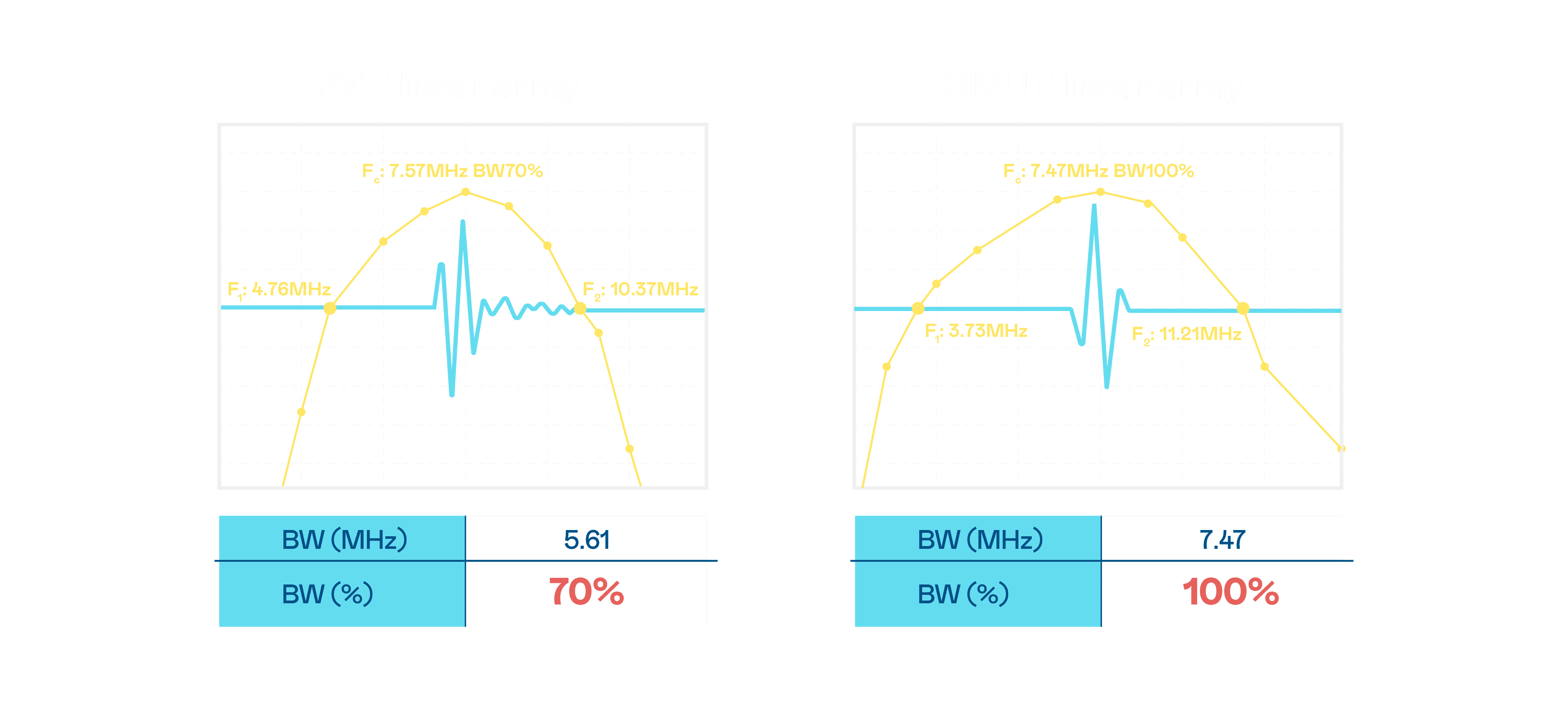 超音波影像的解析度高低,,首先取决于探头能发出的讯号频宽。。人生就是博 CMUT 可提供高清晰的超音波讯号,,,,提供高频宽、、、、高灵敏度、、影像纹理细节更高的超音波影像,,,协助医护人员缩短影像判读时间及利用精准的医疗影像进行诊断。。。