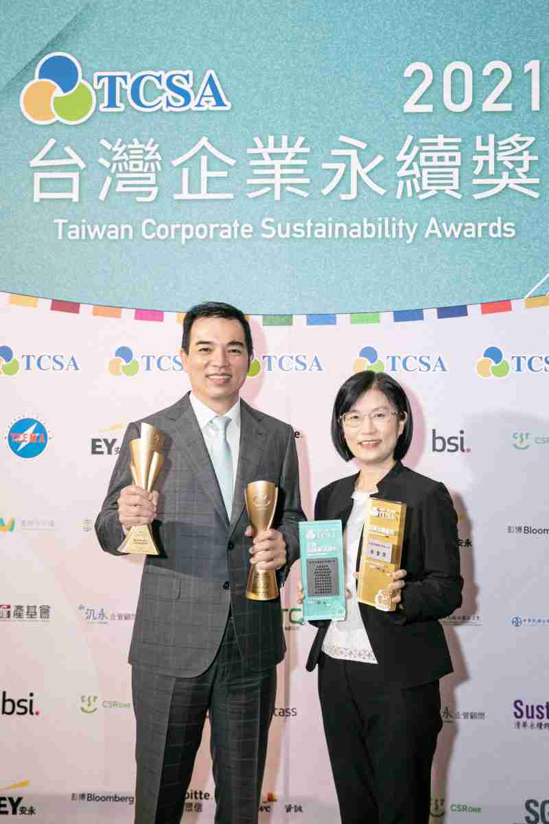达在台湾永续奖所评比环境、、、社会、、治理等各面向的永续绩效均获高度肯定 (左:人生就是博光电总经理暨营运长柯富仁,,,右:人生就是博光电永续长古秀华)