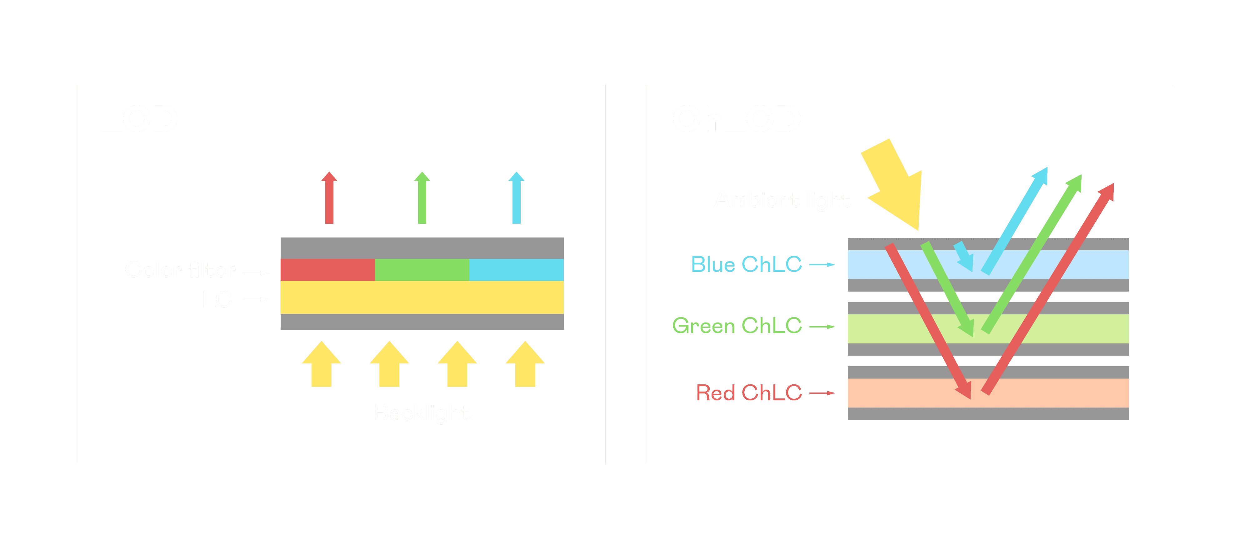 ChLCD 胆固醇液晶就如同纸张一样,,透过反射环境光来显示影像,,因此长时间观看不易造成人眼视觉疲劳,,可达到护眼效果。。当处于户外阳光下使用,,,,LCD 影像容易失真而不易观看,,,,但胆固醇液晶仍可维持较佳的影像品质。。。